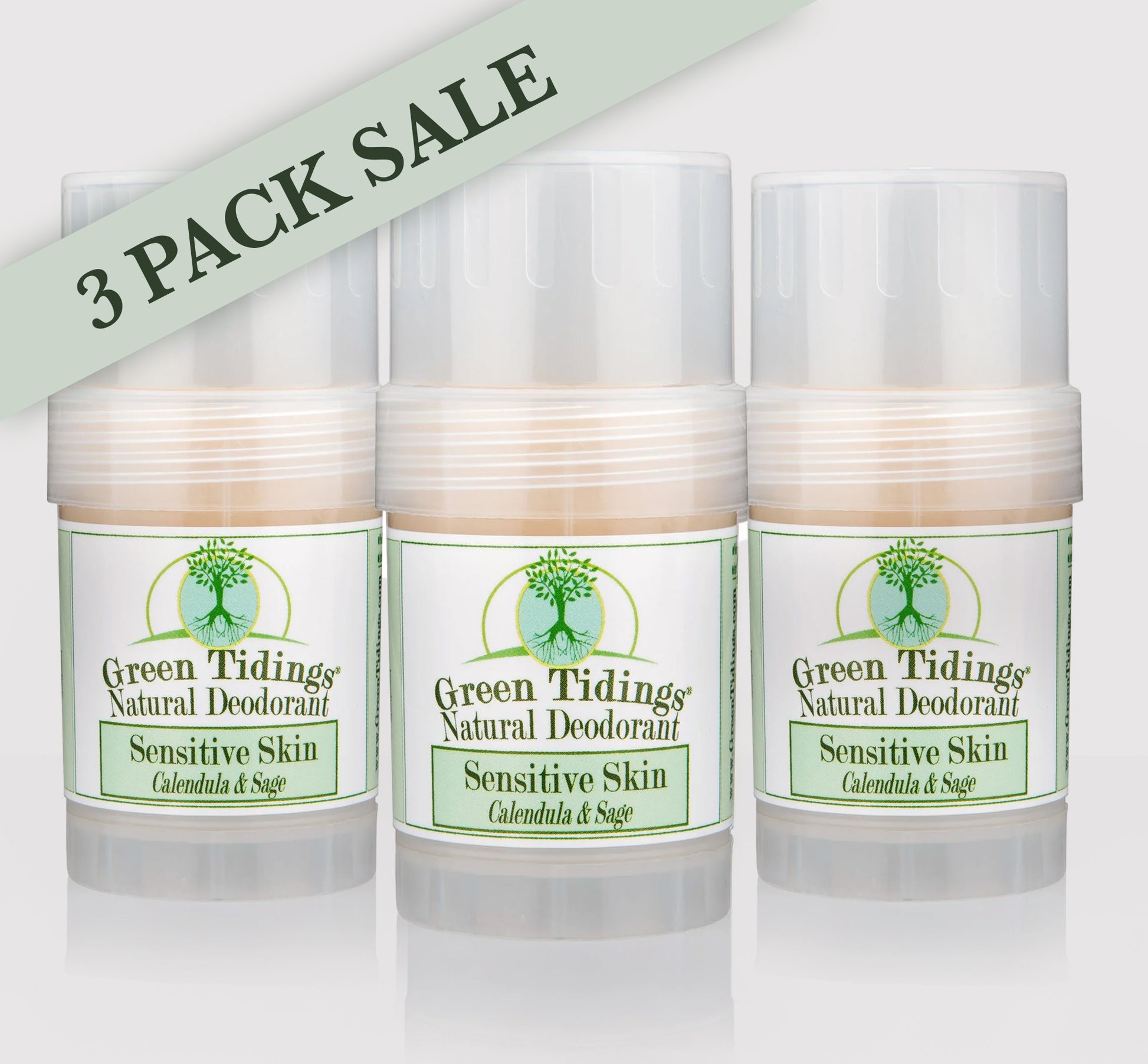 Your beloved, top-rated, favorite Green Tidings All Natural Deodorant is now available in a sensitive skin version, which is baking soda-free. We’ve added a couple of powerful, but gentle, natural odor-fighting ingredients, along with skin soothing Calendula, Jojoba, and Vitamin E. This is our 1 ounce travel/tester size. This is a pack of 3, saving you 15%!
